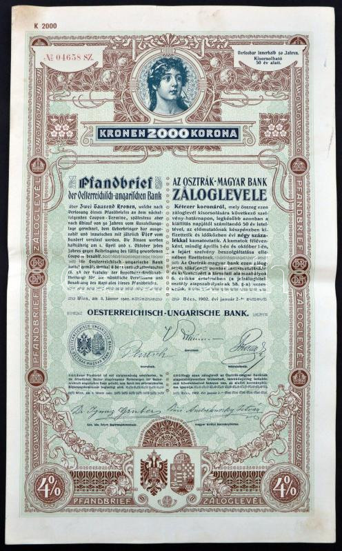 Osztrák-Magyar Monarchia / Bécs 1902. "Osztrák-Magyar Bank" ... https://www.darabanth.com/de/260-Fernauktion/260.0/Numismatik/Aktien-und-Tickets~300027/Osztrak-Magyar-Monarchia-Becs-1902-Osztrak-Magyar-Bank-zaloglevele-2000K-rol-1db-szelven~II1287643