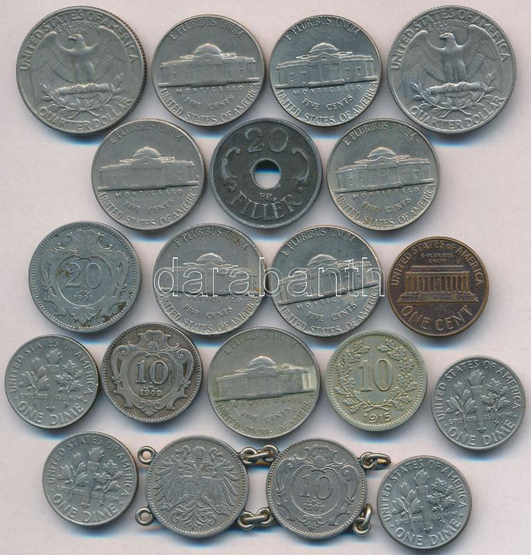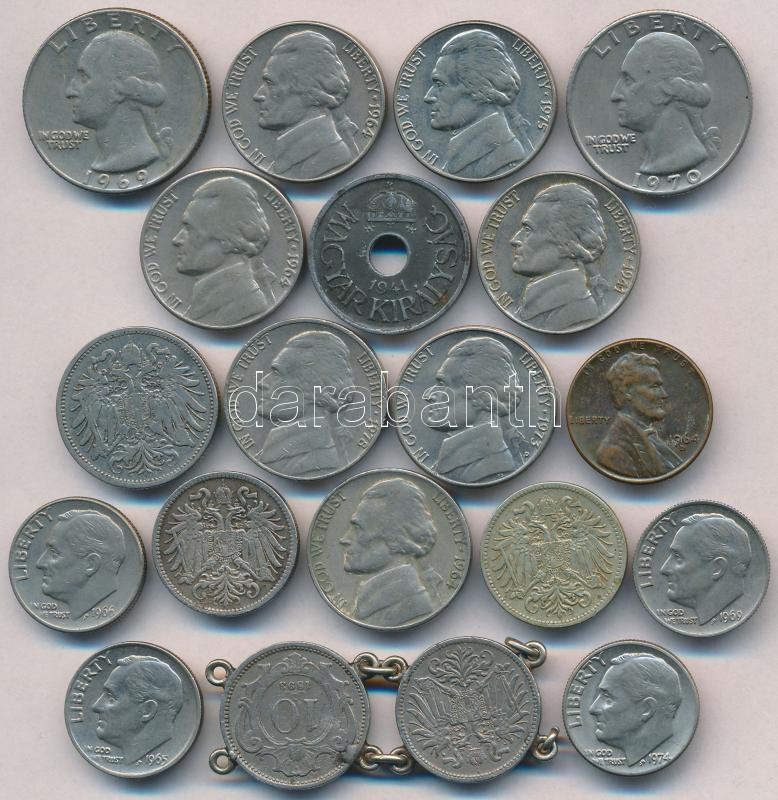 20db-os vegyes magyar és külföldi fémpénz tétel, főleg külföldi érmékkel, közte Amerikai Egyesült Államok, Ausztria, két érme ékszer része volt T:vegyes
