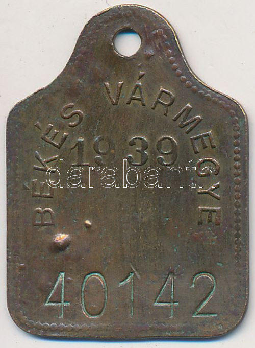 Beschreibung: 1939. "Békés Vármegye" fém ebbárca, sorszámozott T:2-