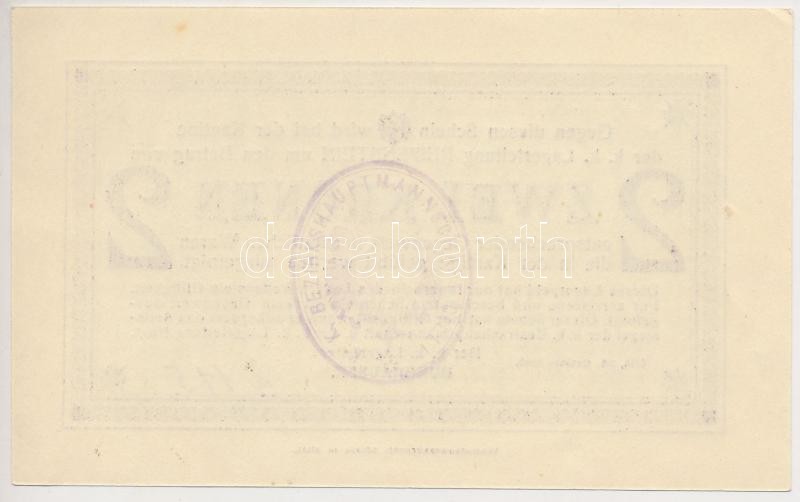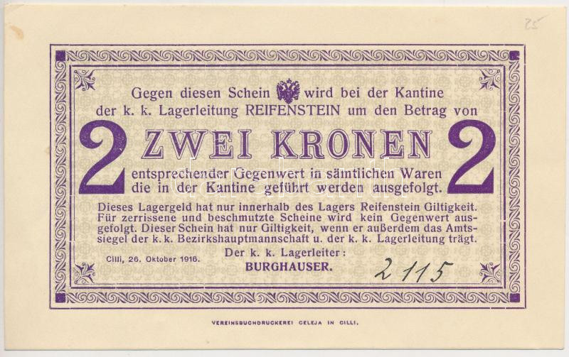 Ausztria / Cilli / Reifenstein tábor 1916. 2K hátlapon bélyegzéssel T:... https://www.darabanth.com/de/260-Fernauktion/260.0/Numismatik/Notgelden~300005/Ausztria-Cilli-Reifenstein-tabor-1916-2K-hatlapon-belyegzessel-TI---Austria-Cilli-Reif~II1285463