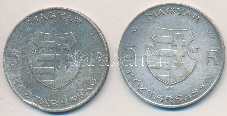 1947. 5Ft Ag "Kossuth" (2x) T:3 https://www.darabanth.com/de/260-Fernauktion/260.0/Numismatik/Ungarische-Munzen-und-Munzen-mit-ungarischem-Munzzeichen~300007/1947-5Ft-Ag-Kossuth-2x-T3~II1283776