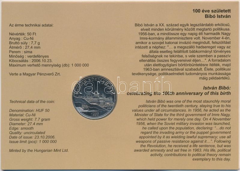 2006. 50Ft "100 éve született Bibó István" emlékkiadás emlék... https://www.darabanth.com/de/260-Fernauktion/260.0/Numismatik/Ungarische-Munzen-und-Munzen-mit-ungarischem-Munzzeichen~300007/2006-50Ft-100-eve-szuletett-Bibo-Istvan-emlekkiadas-emleklapon-T1~II1287633
