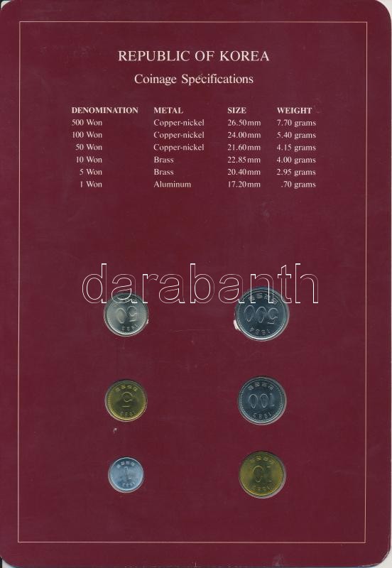 Dél-Korea 1983-1984. 1W-500W 6xklf, "Coin Sets of All Nations" forgalmi szett felbélyegzett kartonlapon T:1,1- South Korea 1983-1984. 1 Won - 10 Won 6xdiff, "Coin Sets of All Nations" coin set on cardboard with stamp C:UNC,AU