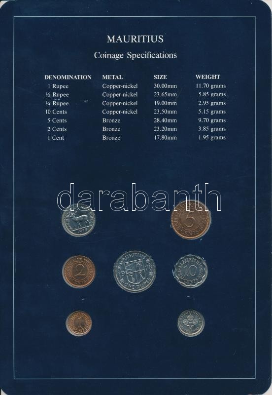 Mauritius 1978. 1c - 1R 7xklf db, forgalmi szett felbélyegzett kartonl... https://www.darabanth.com/de/260-Fernauktion/260.0/Numismatik/Weltweit-Munzen~300020/Mauritius-1978-1c--1R-7xklf-db-forgalmi-szett-felbelyegzett-kartonlapon-T1--Mauritius-1978-1-C~II1284542