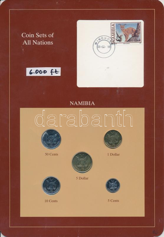 Namíbia 1993-1996. 5c - 5$ 5xklf db, forgalmi szett felbélyegzett kartonlapon T:1 Namibia 1993-1996. 5 Cents - 5 Dollars 5xdiff, coin set on cardboard with stamp C:UNC