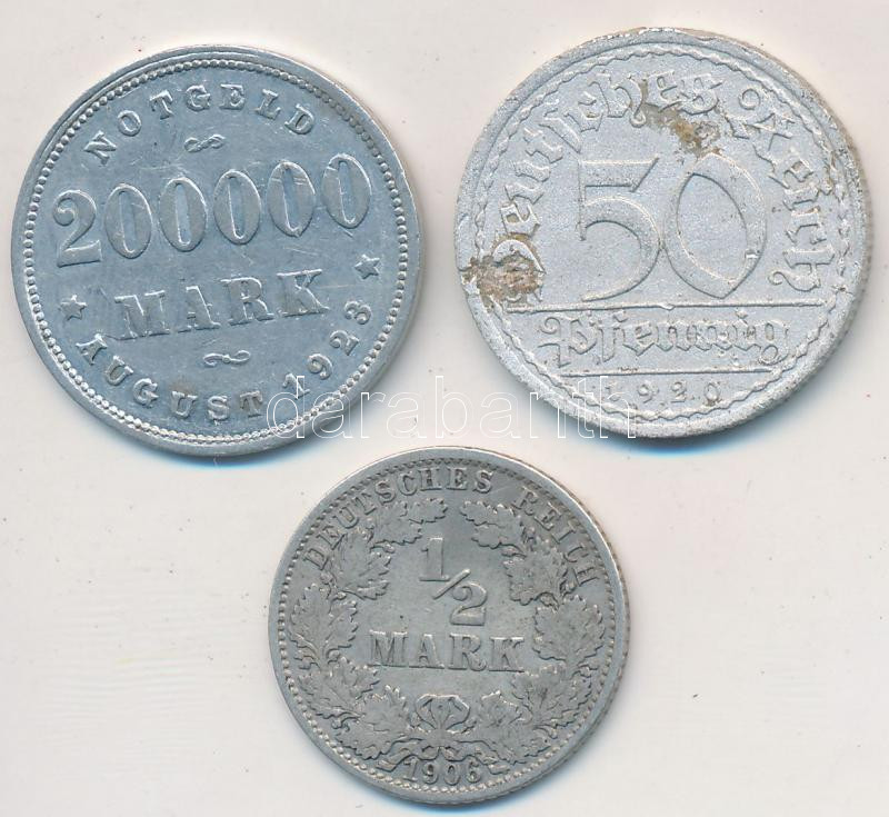 Német Birodalom 1906A 1/2M Ag + Weimari Köztársaság 1920A 50pf Al + Hamburg 1923J 200.000M Al szükségpénz T:2,2-