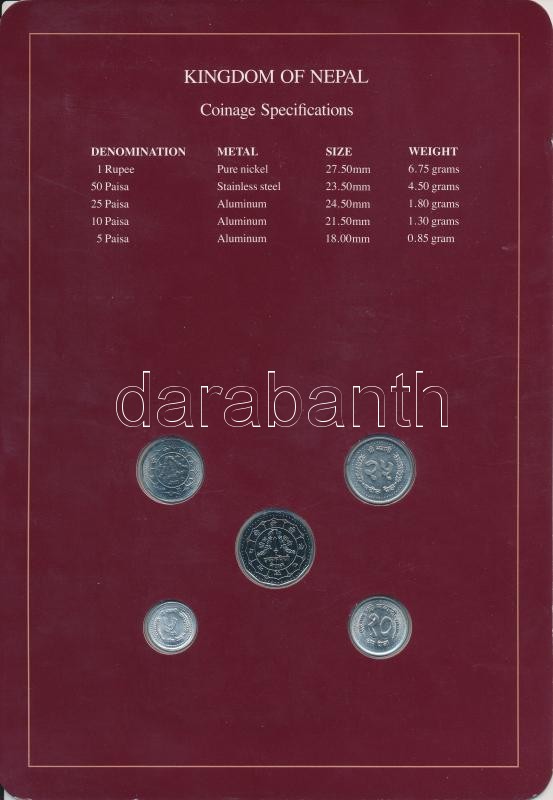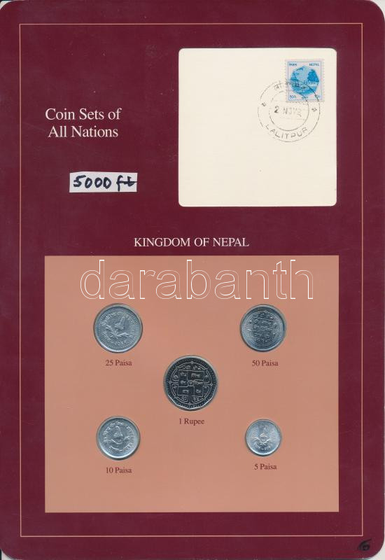 Nepál 1988. 5p - 1R 5xklf db, forgalmi szett felbélyegzett kartonlapon... https://www.darabanth.com/de/260-Fernauktion/260.0/Numismatik/Weltweit-Munzen~300020/Nepal-1988-5p--1R-5xklf-db-forgalmi-szett-felbelyegzett-kartonlapon-T1--Nepal-1988-5-Paisa--~II1284206
