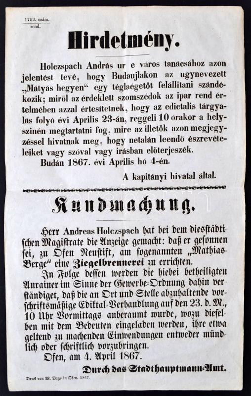 1867 Hirdetmény téglaégető felállításáról "Mátyás hegyen", B... https://www.darabanth.com/de/261-Fernauktion/261.0/Andere-Sammelgebiete/Drucksachen~29/1867-Hirdetmeny-teglaegeto-felallitasarol-Matyas-hegyen-Budaujlakon-38x23cm~II1296202
