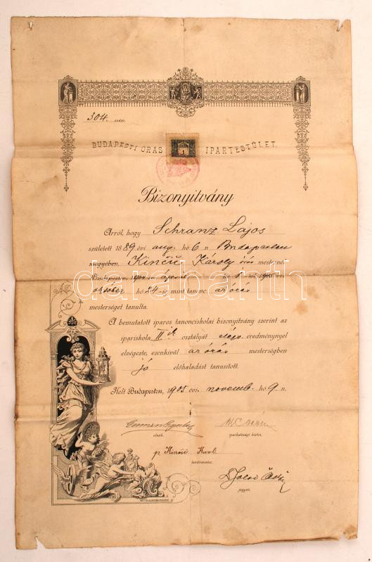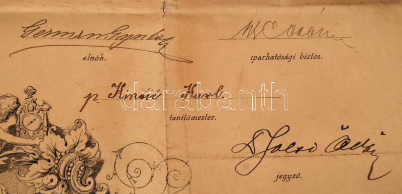 1905 Bizonyítvány, Budapesti órás Ipartestület, kissé viseltes állapot... https://www.darabanth.com/de/261-Fernauktion/261.0/Andere-Sammelgebiete/Drucksachen~29/1905-Bizonyitvany-Budapesti-oras-Ipartestulet-kisse-viseltes-allapotban-~II1258097