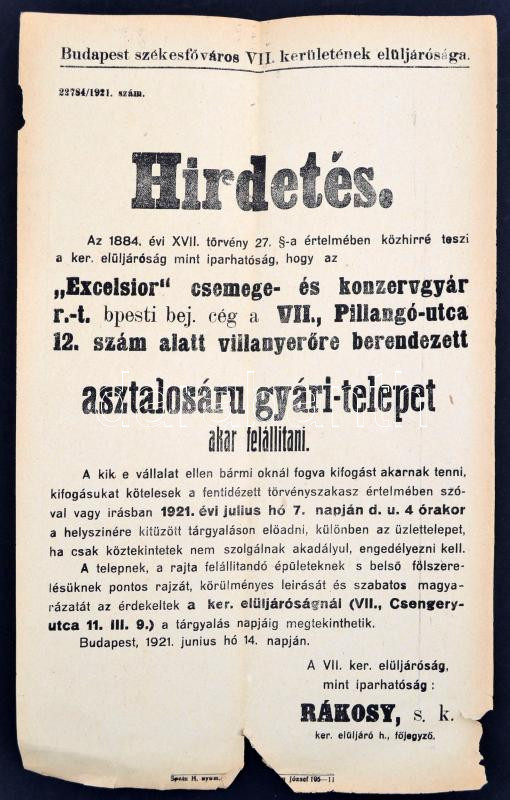 1921 Hirdetés Az "Excelsior" csemege- és konzervgyár asztalo... https://www.darabanth.com/de/261-Fernauktion/261.0/Andere-Sammelgebiete/Drucksachen~29/1921-Hirdetes-Az-Excelsior-csemege-es-konzervgyar-asztalosaru-gyari-telepet-akar-felallita~II1294762