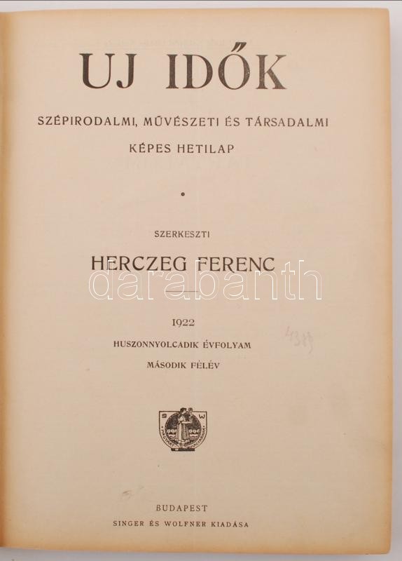 1922 Az Új idők c. folyóirat II.kötet. Szépirodalmi művészeti és társadalmi képes hetilap. Szerkeszti: Herczeg Ferenc. Singer és Wolfner. Kopott, korabeli díszes félvászon kötésben.