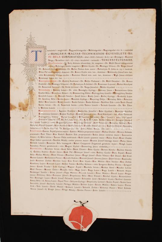 1931 A "Hungária" Magyar Technikusok egyesületének (irredenta egyesület) meghívója XII. táncestélyre. 1920-as száraz pecséttel, számos meghívott nevével. A hátoldalán kissé elszennyeződött, a hajtások mentén apró sérülések.