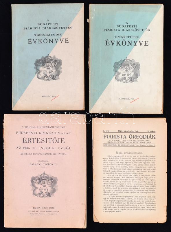 1936-40 Vegyes nyomtatvány tétel, 4db: Piarista Diákszövetség évkönyve... https://www.darabanth.com/de/261-Fernauktion/261.0/Andere-Sammelgebiete/Drucksachen~29/1936-40-Vegyes-nyomtatvany-tetel-4db-Piarista-Diakszovetseg-evkonyve-2db-plus-Piarista-Oreg~II1288381