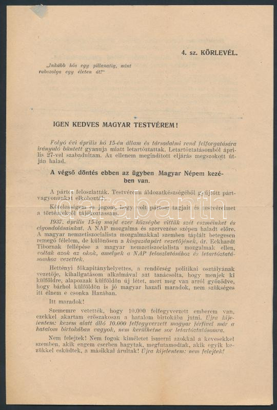 Beschreibung: 1937 Szálasi Ferenc 4. számú körlevele, melyben letartóztatásáról és ennek jelentőségéről ír 4p.