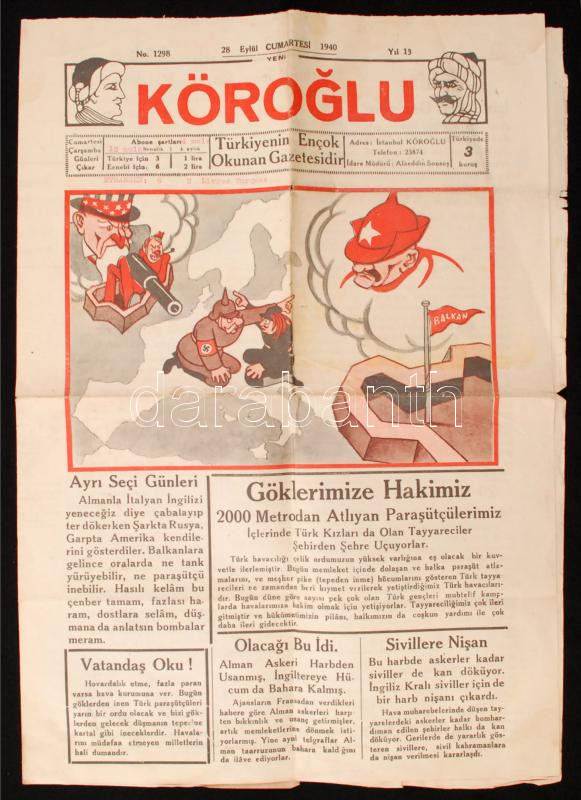 1940 Köroglu török újság, 4p / Köroglu turkish newspaper https://www.darabanth.com/de/261-Fernauktion/261.0/Andere-Sammelgebiete/Drucksachen~29/1940-Koroglu-torok-ujsag-4p-Koroglu-turkish-newspaper~II1291649
