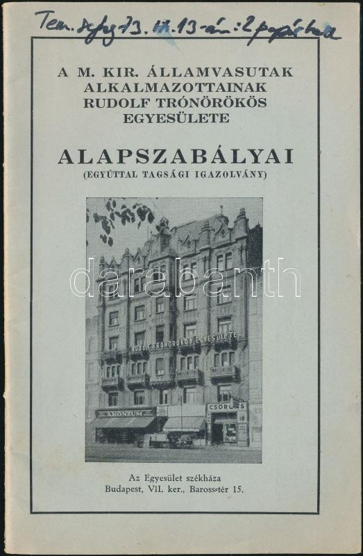 1941 A M. Kir. Államvasutak alkalmazottainak Rudolf Trónörökös Egyesül... https://www.darabanth.com/de/261-Fernauktion/261.0/Andere-Sammelgebiete/Drucksachen~29/1941-A-M-Kir-Allamvasutak-alkalmazottainak-Rudolf-Tronorokos-Egyesulete-alapszabalyai-pp~II1291530