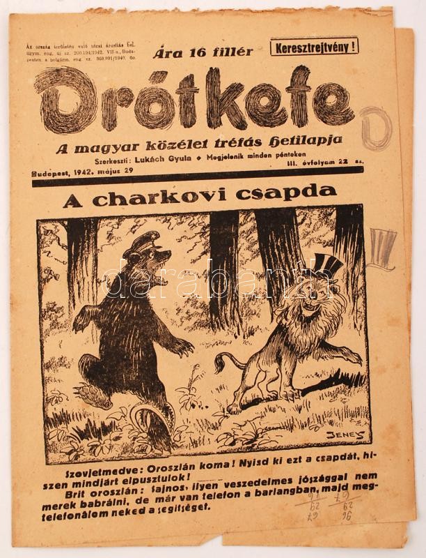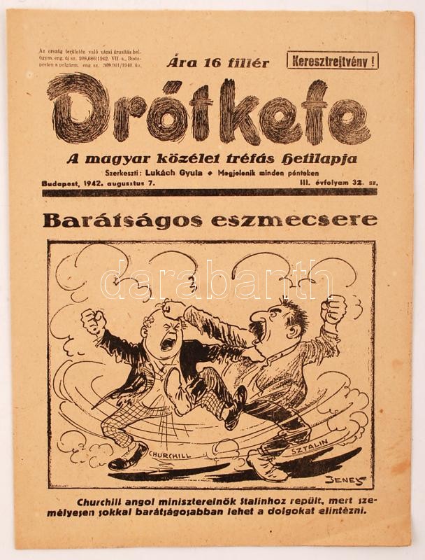 1942 Drótkfefe, A magyar közélet tréfás hetilapja, szerk.:Lukách Gyula... https://www.darabanth.com/de/261-Fernauktion/261.0/Andere-Sammelgebiete/Drucksachen~29/1942-Drotkfefe-A-magyar-kozelet-trefas-hetilapja-szerkLukach-Gyula-3-szama-pp8-32x24~II1249598