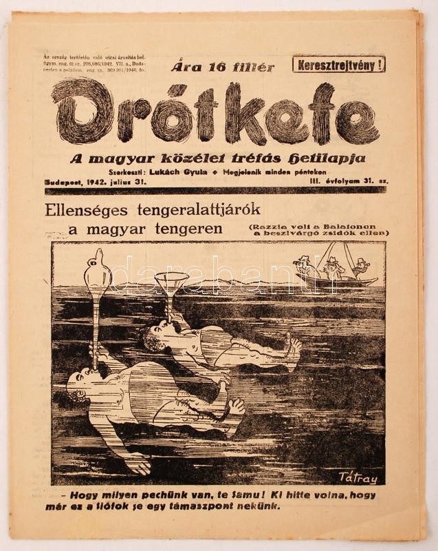 1942 Drótkfefe, A magyar közélet tréfás hetilapja, szerk.:Lukách Gyula... https://www.darabanth.com/de/261-Fernauktion/261.0/Andere-Sammelgebiete/Drucksachen~29/1942-Drotkfefe-A-magyar-kozelet-trefas-hetilapja-szerkLukach-Gyula-3-szama-pp8-32x24~II1249612