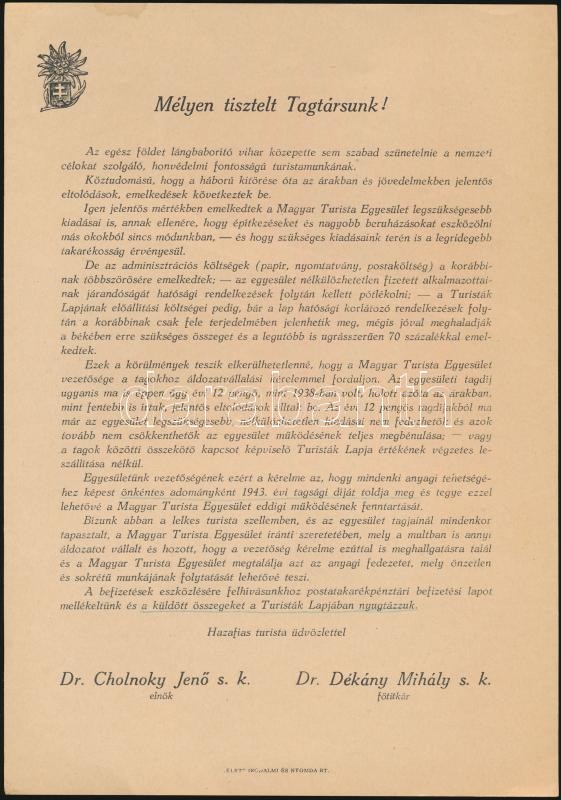 1943, 1960 2 db turistasággal kapcsolatos nyomtatvány https://www.darabanth.com/de/261-Fernauktion/261.0/Andere-Sammelgebiete/Drucksachen~29/1943-1960-2-db-turistasaggal-kapcsolatos-nyomtatvany~II1291914