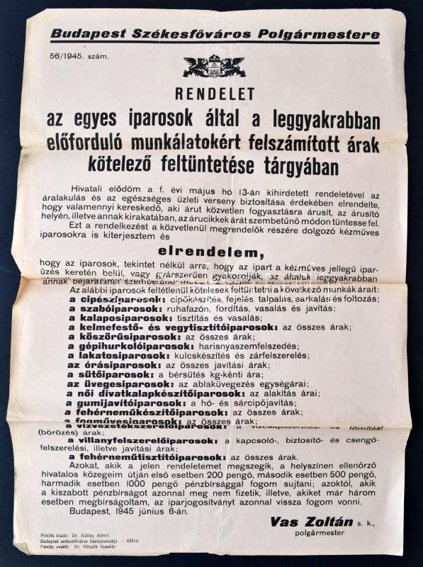 1945 Rendelet az egyes iparosok által a leggyakrabban előforduló munkálatokért felszámított árak kötelező feltüntetése tárgyában, Budapest Székesfőváros Polgármestere, plakát, 46x31cm