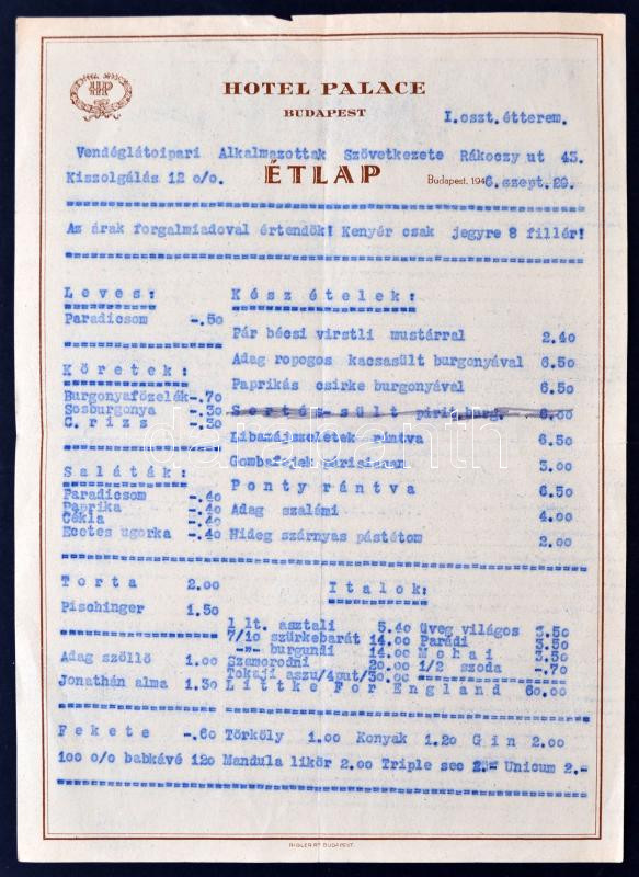 1946 Hotel Palace étlap, 29x20cm https://www.darabanth.com/de/261-Fernauktion/261.0/Andere-Sammelgebiete/Drucksachen~29/1946-Hotel-Palace-etlap-29x20cm~II1295987