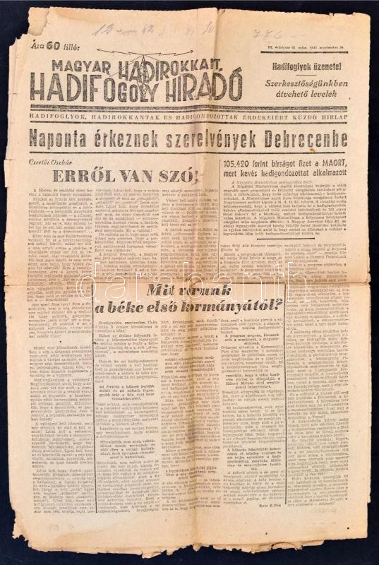 1947 Magyar Hadirokkant Hadifogoly Híradó, kissé szakadozott, pp.:6, 4... https://www.darabanth.com/de/261-Fernauktion/261.0/Andere-Sammelgebiete/Drucksachen~29/1947-Magyar-Hadirokkant-Hadifogoly-Hirado-kisse-szakadozott-pp6-47x31cm~II1255303