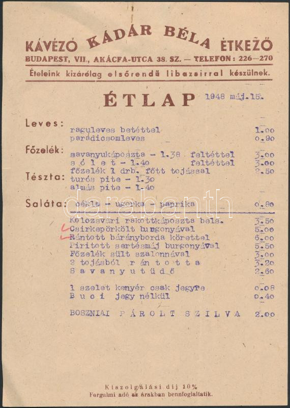 1948 Kádár Béla Kávézó, Étkező étlap, 20x14cm https://www.darabanth.com/de/261-Fernauktion/261.0/Andere-Sammelgebiete/Drucksachen~29/1948-Kadar-Bela-Kavezo-Etkezo-etlap-20x14cm~II1295408