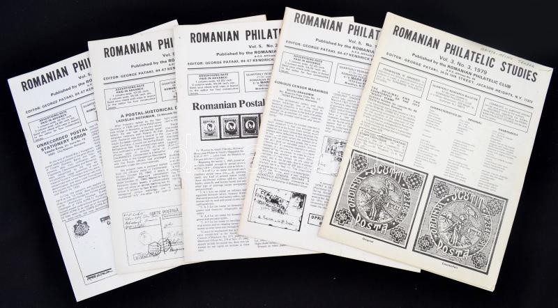 1979-81 Romanian Philatelic Studies, 5 száma angol nyelven, cca 16olda... https://www.darabanth.com/de/261-Fernauktion/261.0/Andere-Sammelgebiete/Drucksachen~29/1979-81-Romanian-Philatelic-Studies-5-szama-angol-nyelven-cca-16oldal-28x22cmplus-48-elonyomott-la~II1290662