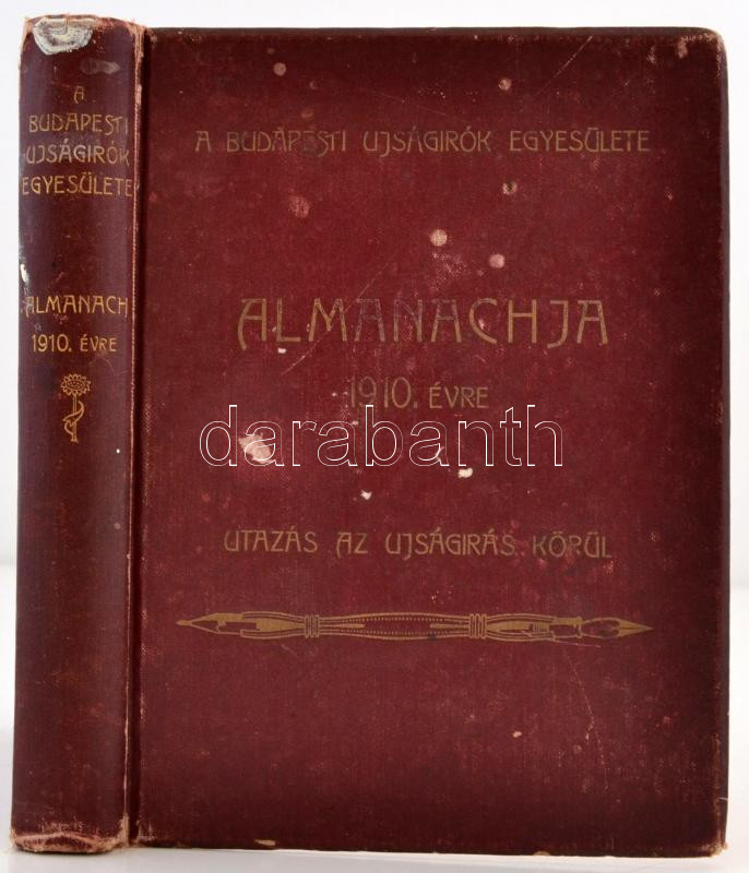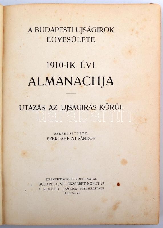 A Budapesti Ujságírók Egyesülete 1910-ik évi almanachja.Utazás az újságírás körül. Szerk. Szerdahelyi Sándor. Bp. (1909. Révai és Salamon.) 229 l. 58 lev. (Hirdetések.) Aranyozott kiadói egészvászon-kötésben. A kötet központi témája az újságírás. Külön fejezet foglalkozik a jubiláns Pesti Hírlappal és Mikszáth Kálmánnal. Mikszáth, Heltai, Molnár Ferenc és Ambrus Zoltán írásaival. A reklámanyagban érdekes írások olvashatók többek között neves vendéglőkről, mint a Kommer-Gundel féle Virágbokorról, a Wampeticsről ill. az Uj Idők kávéházról. A kötés Gottermayer Nándor műhelyében készült.