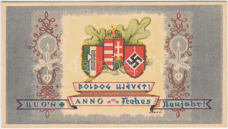 cca 1940 Boldog új évet, népies üdvözlőkártya Bozó jelzéssel, 12 × 7 c... https://www.darabanth.com/de/261-Fernauktion/261.0/Andere-Sammelgebiete/Drucksachen~29/cca-1940-Boldog-uj-evet-nepies-udvozlokartya-Bozo-jelzessel-12-C397-7-cm-allies-of-Hungar~II1289389