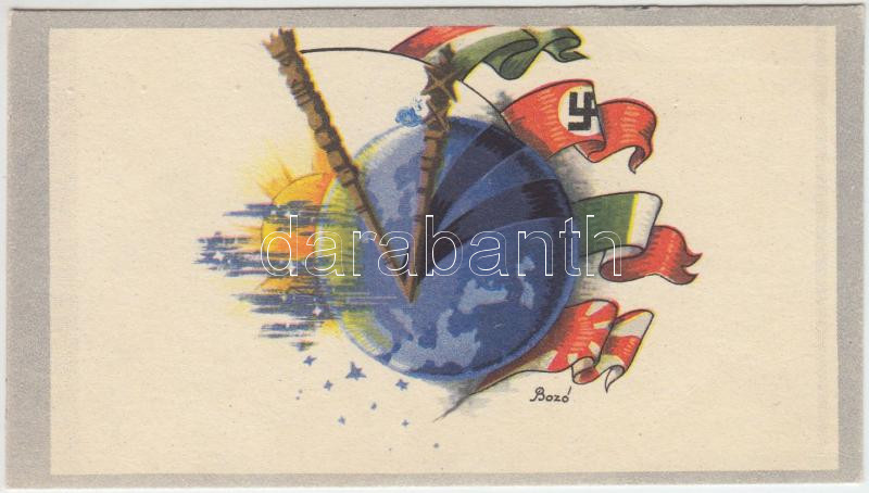 Beschreibung: cca 1940 Háborús szövetségesek (Németország, Japán, Magyarország), népies üdvözlőkártya Bozó jelzéssel, 12 × 7 cm / Irredenta propaganda card, allies of Hungary, minicard