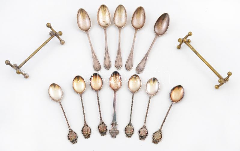 Beschreibung: 12 db különféle ezüstözött kiskanál + 2 db késbak, különböző méretben