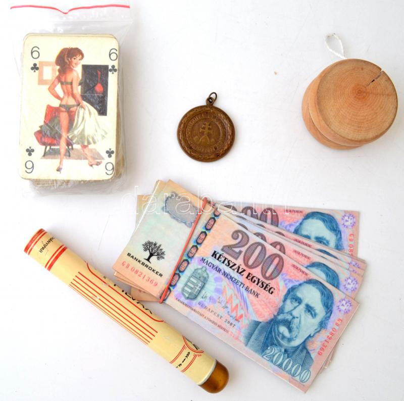 Beschreibung: Vegyes bolha tétel: kártya, játékpénz, medál, szivardoboz, jojó, 5db