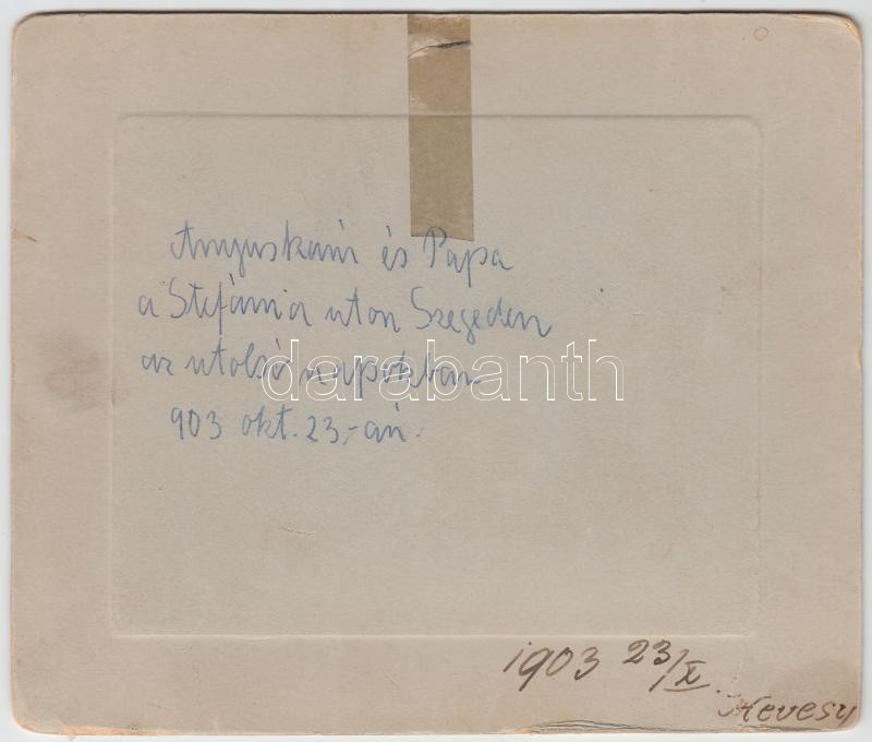 Beschreibung: 1903 Szeged, Stefánia út, idős házaspár a Tisza-parton, fotó, kartonra kasírozva, hátulján feliratozva, 9×11,5 cm