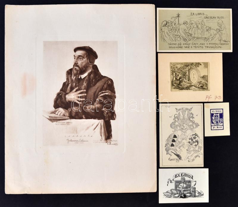 4 db érdekes ex libris: Georg Barlösius (1864-1908): Ex libris, 2 db, klisé, papír, 7x5 cm, illetve 10x7 cm; Mikoláš Aleš (1852-1913): Ex libris, 2 db, klisé, papír, klisén jelzettek, 13x9 cm, illetve 15x9 cm; valamint 2 érdekes metszet: Binder János Fülöp (1735-1811): rézmetszet, új nyomat, 6x8cm + Johannes Calvinus klisé, nyomat, 24x17cm.