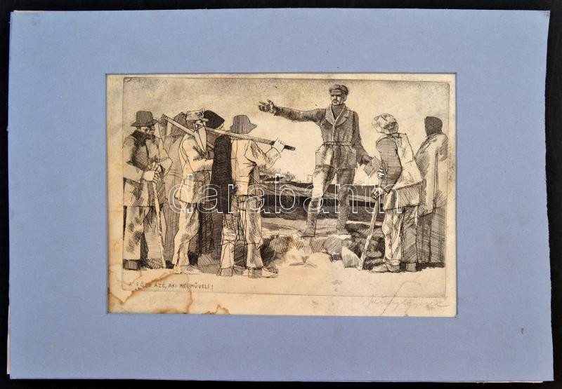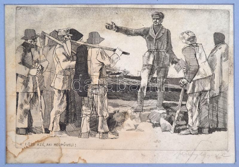 Beschreibung: Feledy Gyula (1928-2010): A föld azé, aki megműveli. Rézkarc, papír, foltos, koszos, jelzett, 19×29 cm