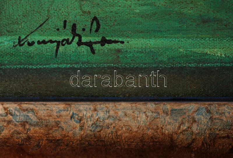 Beschreibung: Komjáti Géza (1956-): Málnás csendélet. Olaj, farost, jelzett, keretben, 50×40 cm