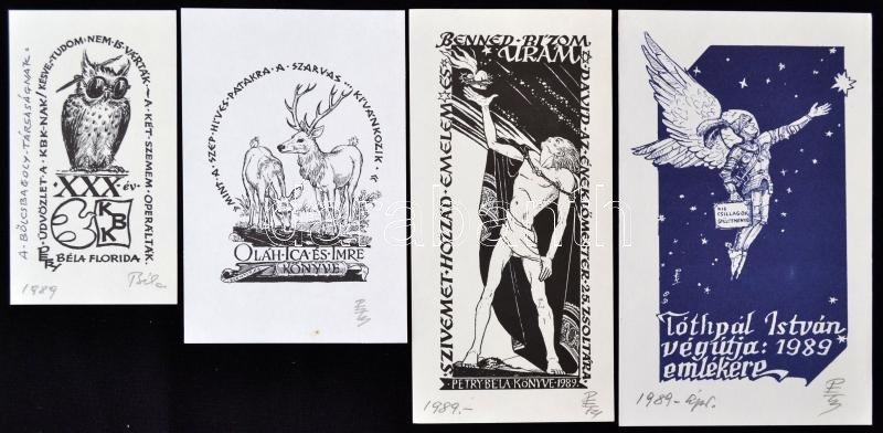 Beschreibung: Petry Béla (1902-1996): 4 db ex libris érdekes témákban, klisé, papír, jelzettek, különböző méretben