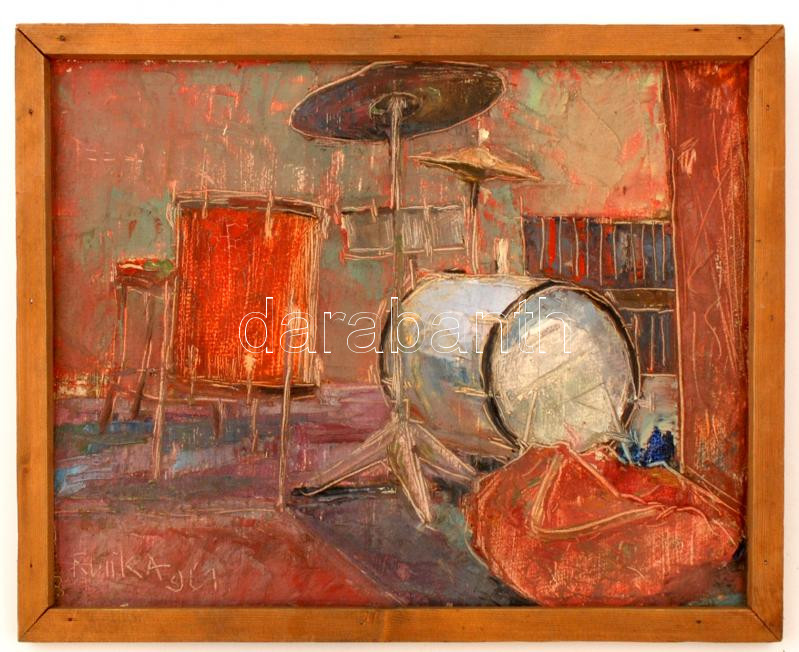 Beschreibung: Ruttka Ferenc (1926-): Dob szett. Olaj, farost, jelzett, keretben, 31×39 cm