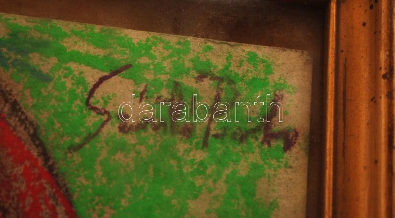 Beschreibung: Szántó jelzéssel: Piros fejkendős asszony. Pasztell, papír, üvegezett keretben, 26×17 cm