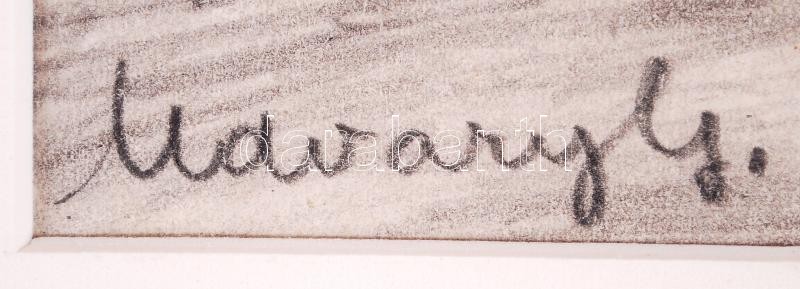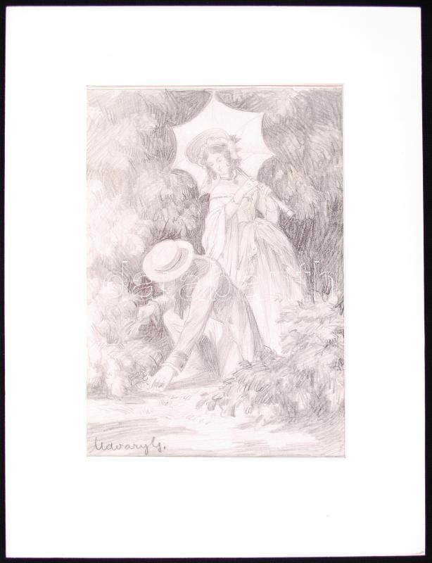 Beschreibung: Udvary Géza (1872-1932): Udvarlás. Ceruza, papír, jelzett, paszpartuban, 24×17 cm