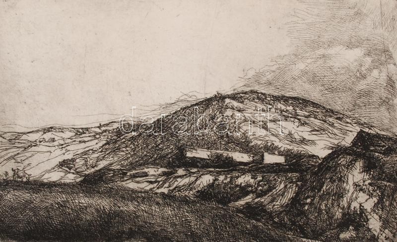 Beschreibung: Varga Nándor Lajos (1895-1978): Dombos táj. Rézkarc, papír, jelzett, paszpartuban, 9×14 cm