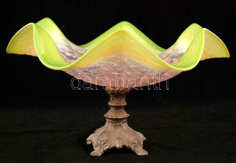 Beschreibung: Díszes fémtalpas hullámos festett üveg kínáló, jelzés nélkül, apró kopásnyomokkal, d: 31 cm, m: 18 cm