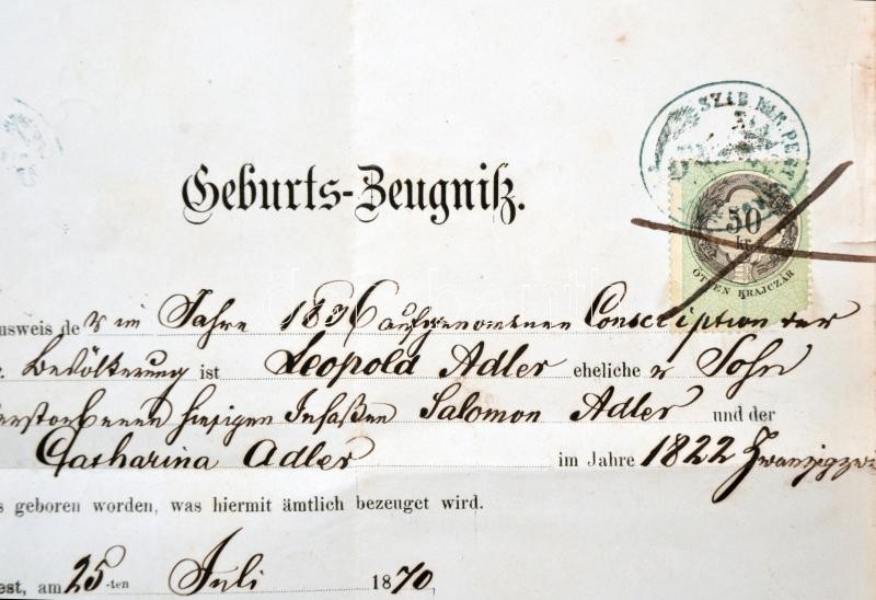 Beschreibung: 1870 Geburts-Zeugnis, Születési anyakönyvi igazolás izraelita vallású személy részére, okmánybélyeggel (50kr.), száraz pecséttel, 34x21cm