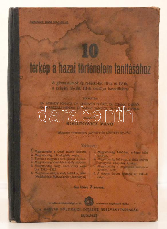 A gimnáziumok és reáliskolák II-ik és IV-ik, a polgári iskolák III-ik osztálya használatára. Tervezték: Acsády Ignácz, Cherven Flóris, Csánki Dezső stb. Rajzolta Kogutowicz Manó. 2. jav. bőv. kiad. Bp. é. n. Magyar Földrajzi Intézet Kiadói, ázástól foltos, hullámos félvászon-kötésben