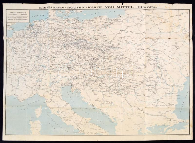 cca 1902 Ritter, Julius: Eisenbahn-Routen-Karte von Mitteleuropa, lépték nélkül, Verlag von R. von Waldheim, Bécs, a hajtások mentén szakadásokkal, 65,5×80 cm