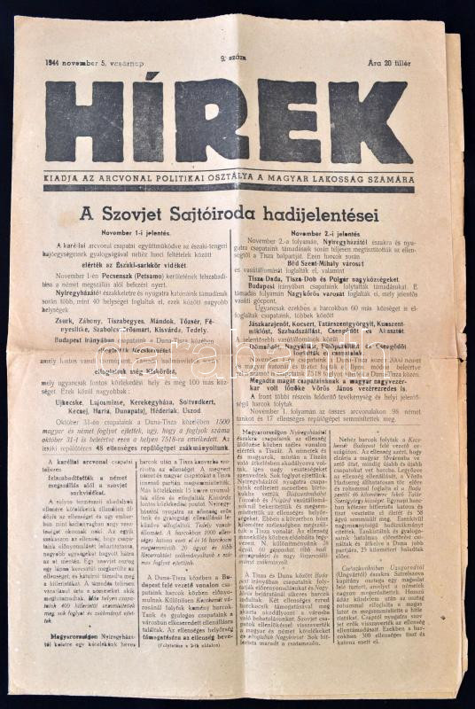Beschreibung: 1944 A Hírek c, újság november 5-i száma, benne az előrenyomuló szovjet csapatok híreivel
