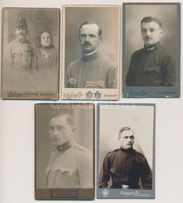 Beschreibung: cca 1900-15 Vegyes, keményhátú kabinetfotók katonákról különböző magyar műtermekből, 5db, cca 10x6cm