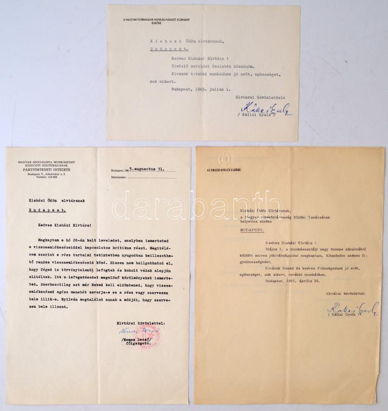 1965- 67 Kállai Gyula (1910-1996) miniszterelnök, később az országgyűlés elnökének három darab géppel írott, fejléces, aláírt köszönőlevele Kisházi Ödönnek (1900-1975) korábbi munkaügyi miniszternek, az Elnöki Tanács helyettes elnökének, rajta az MSZMP Központi Bizottságának pecsétjével;valamint Nemes Dezső (1908-1985) a Párttörténeti Intézet főigazgatójának aláírt köszönőlevele, szintén Kisházi Ödönnek.