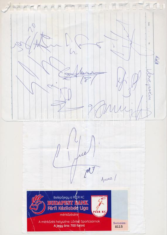 Beschreibung: A Veszprém kézilabda csapata tagjainak aláírása papírlapon(Gál Gyula, Iváncsik Ferenc, Marian Cozma, Mocsai Lajos, stb.)